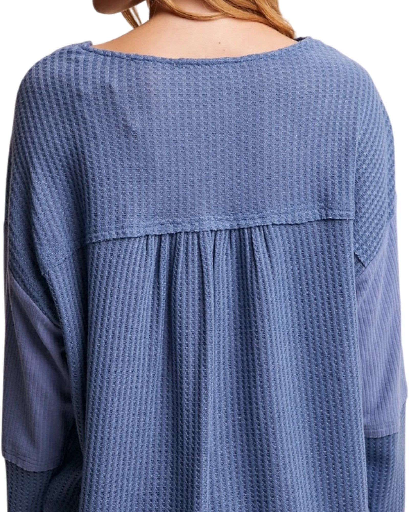 An easygoing and casual yet stylish top. The Indigo Lace Up Waffle Top features a soft waffle knit body with mixed texture details and a lace up neckline that adds interest without feeling overdone. Relaxed and wearable, it’s the kind of piece that looks styled even when you keep everything else simple.