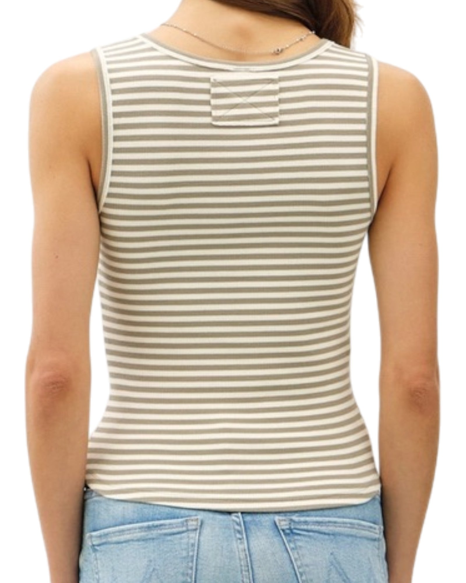 Khaki Striped Ribbed Cotton Blend Sleeveless Top