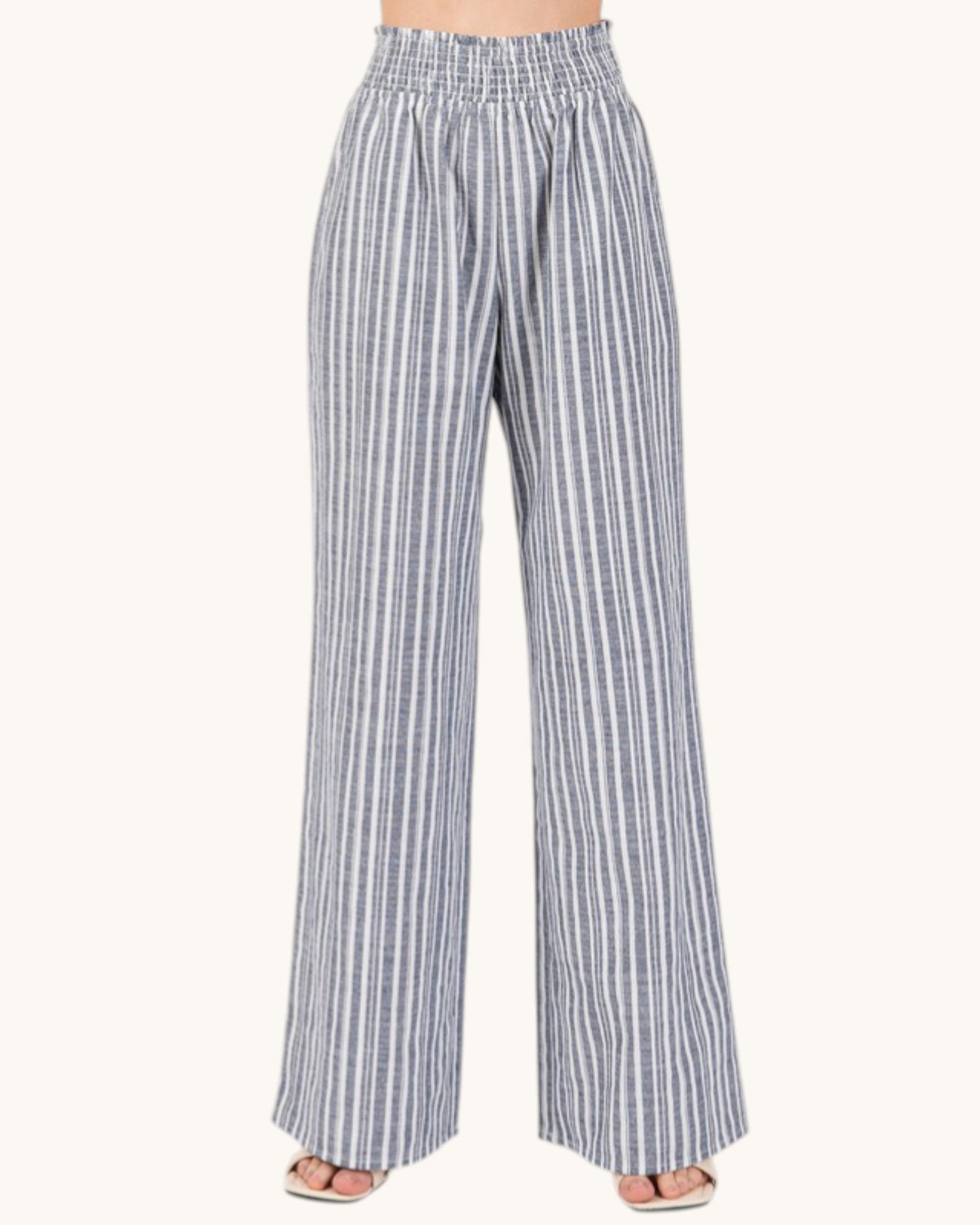 These wide-leg pants have a relaxed, easy feel that still looks completely intentional. The linen blend gives them a natural, breathable drape, while the smocked waistband and pull-on design make them as comfortable as they are chic. The navy and ivory stripe is subtle and sophisticated; the kind of print that pairs just as easily with a fitted tank as it does a breezy blouse.